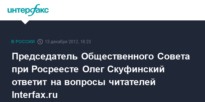 Москва. 13 декабря. INTERFAX.RU - Во вторник, 18 декабря, с 12:00 до 14:00 на сайте Interfax.ru состоится интернет-конференция председателя Общественного Совета при Федеральной службе государственной регистрации, кадастра и картографии (Росреесте) Олега Александровича Скуфинского.