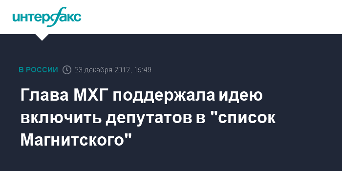 Москва. 23 декабря. INTERFAX.RU - Старейшая в России правозащитница, глава Московской Хельсинкской группы Людмила Алексеева поддерживает инициативу внести в "черный список" США российских депутатов, которые голосовали за "антимагнитский закон". "У нас приняли людоедский закон. Наши депутаты уже наработали на попадание в "Акт Магнитского, и они это понимают", - заявила Л.Алексеева "Интерфаксу" в воскресенье.