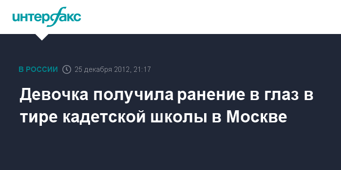 Москва. 25 декабря. INTERFAX.RU - На севере Москвы девочка получила травму глаза, по предварительным данным, ее ранила срикошетившая пуля в тире кадетской школы, сообщили "Интерфаксу" в ГУ МВД России по Москве.