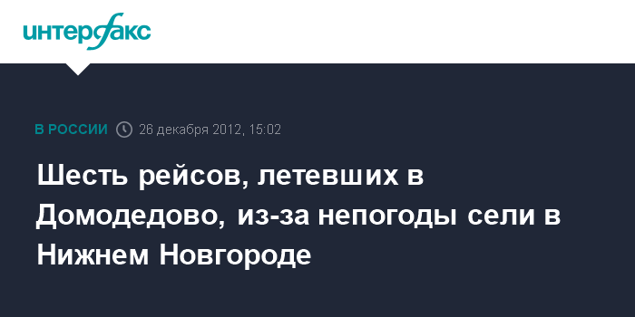 Нижний Новгород. 26 декабря. INTERFAX.RU - Шесть самолетов, направлявшихся в аэропорт Домодедово (Москва), около 12:00 мск из-за неблагоприятных метеоусловий в столице совершили посадку на запасном аэродроме - в международном аэропорту "Нижний Новгород" (МАНН), - сообщили агентству "Интерфакс" в пресс-службе МАНН.