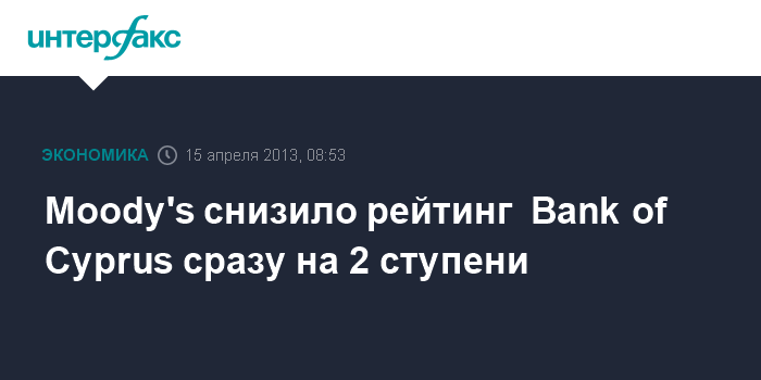 При этом рейтинг по депозитам Bank of Cyprus ухудшен с "Саа3" на одну ступень до "Ca" ("дефолт с минимальными перспективами восстановления"), прогноз этого рейтинга - "негативный".