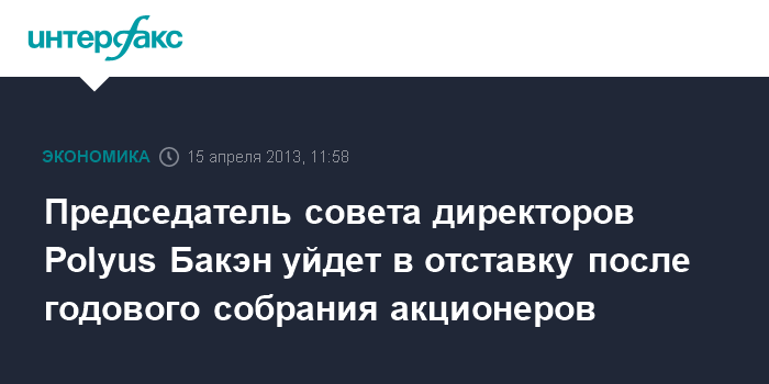 Москва. 15 апреля. INTERFAX.RU - Председатель совета директоров Polyus Gold International Роберт Бакэн уйдет в отставку после годового собрания акционеров компании, говорится в сообщении PGIL.