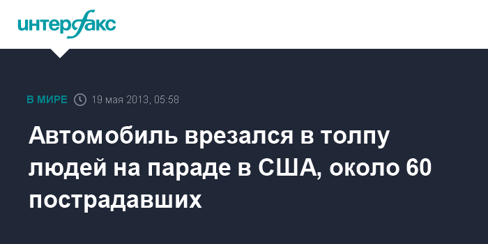 Лондон. 19 мая. ИНТЕРФАКС - Почти 60 человек пострадали в городе Дамаск в американском штате Вирджиния, когда автомобиль въехал в толпу во время парада, передает британская телерадиовещательная корпорация Би-би-си со ссылкой на местные власти.