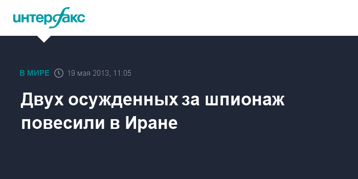 Москва. 19 мая. INTERFAX.RU - В Иране приведена в исполнение смертная казнь через повешение в отношении двух мужчин, приговоренных по обвинению в шпионаже, сообщает в воскресенье британская телерадиокорпорация BBC. По мнению прокуратуры Тегерана, один из казненных - Мохаммад Хейдари - работал на израильскую разведку "Моссад", а второй - Коруш Ахмади - сотрудничал с американским ЦРУ.