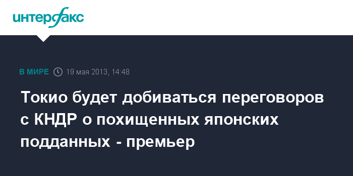 Токио. 19 мая. INTERFAX.RU - Премьер-министр Японии Синдзо Абэ выразил желание начать переговоры с Северной Кореей по вопросу о похищенных северокорейскими спецслужбами японских поданных, сообщают в воскресенье японские СМИ. "Я хочу продолжать переговоры или диалог", - сказал С.Абэ журналистам. "Я определенно буду пытаться обеспечить возвращение на родину всех жертв похищений, искать правду по каждому из случаев и добиваться выдачи похитителей при правительстве Абэ", - добавил премьер.