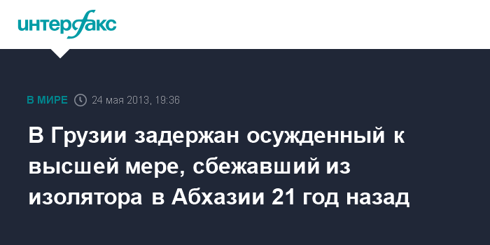 Тбилиси. 24 мая. INTERFAX.RU - Сотрудники полиции задержали 23 мая в Кутаиси (регион Имерети, Западная Грузия) осужденного в Абхазии за убийство, который был объявлен в розыск после побега в августе 1992 года, сообщает пресс-служба МВД Грузии в пятницу.