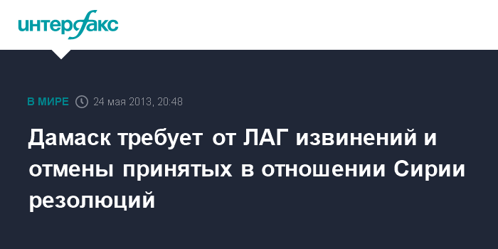 "Мы сможем расценивать ЛАГ в качестве одного из участников мирного урегулирования сирийского конфликта только в том случае, если эта организация принесет извинения народу и властям Сирии, а также отменит все принятые в отношении нашей страны резолюции", - говорится в заявлении, распространенном по каналам сирийского государственного агентства SANA.