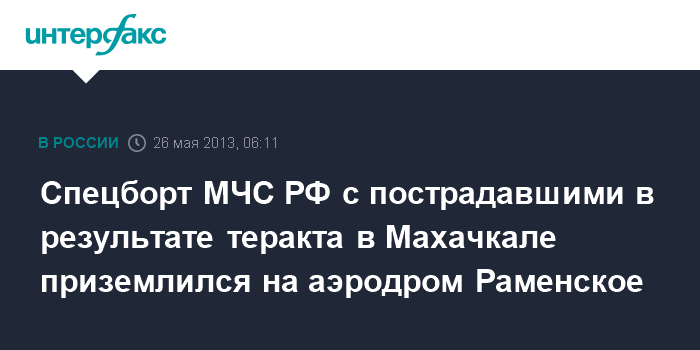 Раменское (Московская область). 26 мая. ИНТЕРФАКС - Самолет МЧС РФ доставил из Дагестана в Москву троих пострадавших в результате теракта в субботу в Махачкале.