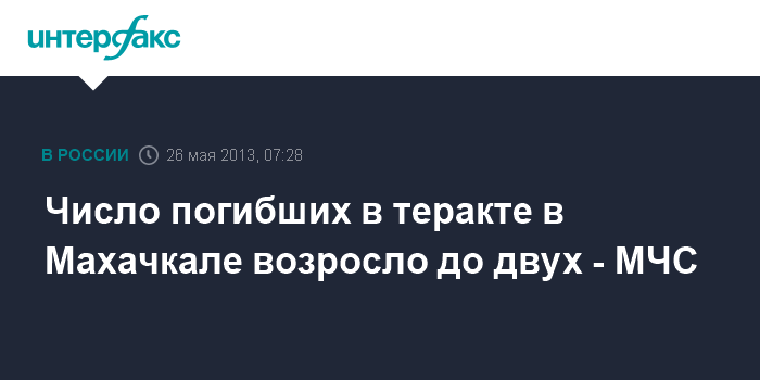 Москва. 26 мая. ИНТЕРФАКС - Теракт в Махачкале в минувшую субботу унес жизни двух человек, сообщили "Интерфаксу" в воскресенье в региональном МЧС РФ.