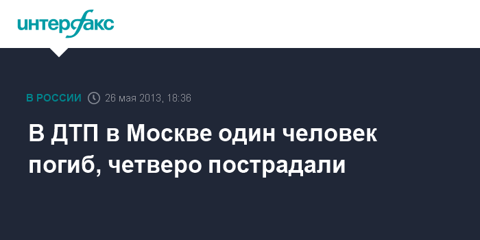 Москва. 26 мая. INTERFAX.RU - Один человек погиб, еще четверо получили ранения в ДТП на юге Москвы, сообщили "Интерфаксу" в пресс-службе столичного управления ГИБДД. "В воскресенье вечером на Варшавском шоссе в районе дома 46 произошло столкновение двух машин, марки и модели которых уточняются", - сказал сотрудник пресс-службы.