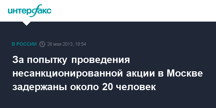 Москва. 26 мая. INTERFAX.RU - Два десятка человек доставлены в полицию за попытку проведения несанкционированной акции в центре столицы, сообщили "Интерфаксу" в пресс-службе ГУ МВД России по Москве. "В воскресенье вечером в отделы полиции были доставлены около 20 человек за попытку проведения мероприятия, не согласованного с исполнительной властью города, в центральной части столицы", - сказал сотрудник пресс-службы. Он добавил, что решается вопрос о привлечении доставленных к административной ответственности.