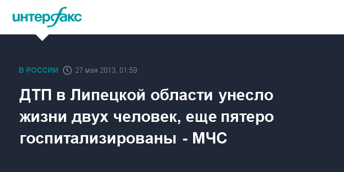 Москва. 27 мая. ИНТЕРФАКС - Два человека погибли и пятеро пострадали в ДТП с участием легкового автомобиля в Липецкой области, сообщили "Интерфаксу" в МЧС России.