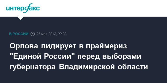 Владимир. 27 мая. INTERFAX.RU - Временно исполняющая обязанности губернатора Владимирской области Светлана Орлова лидирует по итогам четырех этапов праймериз "Единой России" по определению кандидатур для участия в губернаторских выборах, сообщила пресс-служба обладминистрации.