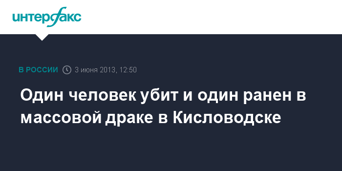 Пятигорск. 3 июня. INERFAX.RU - Полицейские задержали участников массовой драки в Кисловодске (Ставропольский край), в которой был смертельно ранен один человек и еще один госпитализирован, сообщает пресс-служба краевого ГУ МВД.