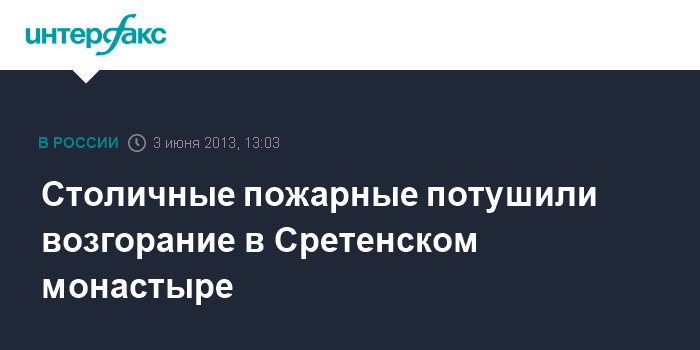 Москва. 3 июня. INERFAX.RU - Пожар, возникший на территории Сретенского ставропигиального мужского монастыря в центре столицы, потушен, пострадавших нет.