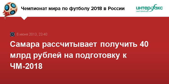 Самара. 6 июня. INTERFAX.RU - Около 40 млрд рублей федеральных денег может получить Самара на строительство стадиона и инфраструктуры в рамках подготовки к чемпионату мира по футболу в 2018 году, сообщил губернатор Самарской области Николай Меркушкин на пресс-конференции в четверг.
