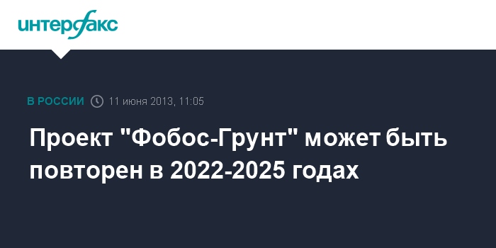 Москва. 11 июня. INTERFAX.RU - Роскосмос повторит проект "Фобос-Грунт" в 2022-2025 гг., сообщил глава Российского космического ведомства Владимир Поповкин.