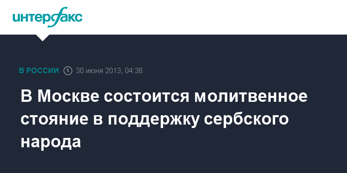 Москва. 30 июня. ИНТЕРФАКС - Молитвенное стояние в поддержку русско-сербского единства и целостности Сербии пройдет 30 июня, в 13:00, на Суворовской площади в Москве.