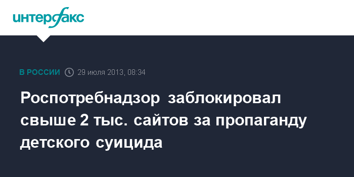 Москва. 29 июля. INTERFAX.RU - Роспотребнадзор заблокировал более 2 тыс. сайтов, которые распространяли запрещенную информацию о детских самоубийствах.