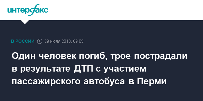 Пермь. 29 июля. INTERFAX.RU - В ДТП в Перми с участием пассажирского автобуса и легкового автомобиля погиб пассажир, еще трое ранены, сообщает ГУ МВД по Пермскому краю в понедельник.