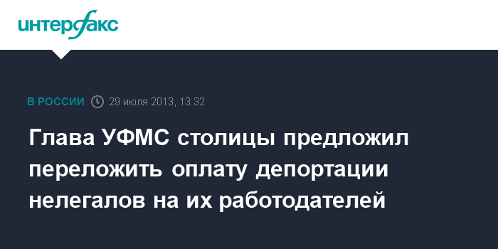 Москва. 29 июля. INTERFAX.RU - Начальник УФМС РФ по Москве Ольга Кириллова считает, что предварительный взнос на покрытие расходов, связанных с возможной депортацией, за трудовых мигрантов должны вносить работодатели.