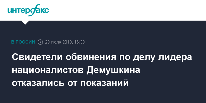 Москва. 29 июля. INTERFAX.RU - Двое свидетелей обвинения, принудительно доставленные в суд по делу против лидера объединения "Русские" Дмитрия Демушкина о деятельности запрещенного "Славянского союза", отказались от показаний.