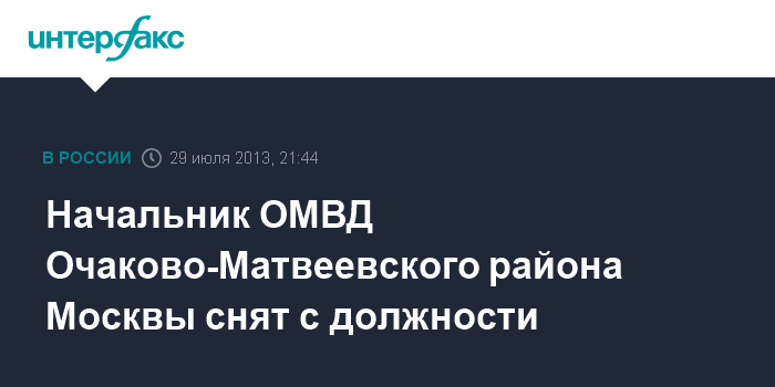 Москва. 29 июля. INTERFAX.RU - Начальник отдела полиции по району Очаково-Матвеевское снят с должности.