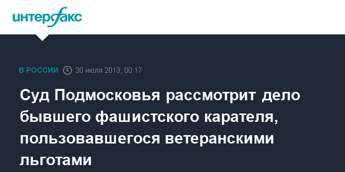 Москва. 30 июля. INTERFAX.RU - Пушкинский городской суд Подмосковья продолжит рассмотрение по существу иска прокуратуры о лишении звания и наград 90-летнего Сергея Маслова, который во время Великой Отечественной войны был нацистским карателем.