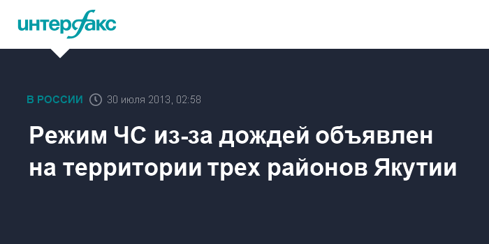 Якутск. 30 июля. ИНТЕРФАКС - ДАЛЬНИЙ ВОСТОК - Глава Якутии Егор Борисов подписал указ об объявлении режима чрезвычайной ситуации на территориях Верхоянского, Момского, Оймяконского районов республики в связи с повышением уровня воды на реках.