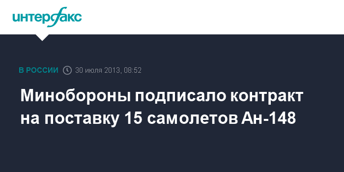 Москва. 30 июля. INTERFAX.RU - Минобороны РФ и "Воронежское акционерное самолетостроительное общество" (ВАСО) подписали контракт на поставку для ВВС России 15 самолетов Ан-148, сообщил во вторник "Интерфаксу" источник в российской самолетостроительной отрасли.