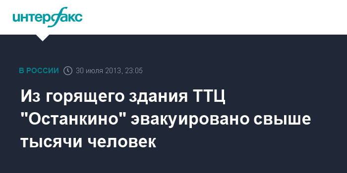Москва. 30 июля. INTERFAX.RU - Спасатели эвакуировали из горящего здания ТТЦ "Останкино" свыше 1 тысячи человек, в здании горят декорации, сообщил "Интерфаксу" начальник пресс-службы ГУ МЧС России по Москве Виктор Бирюков.