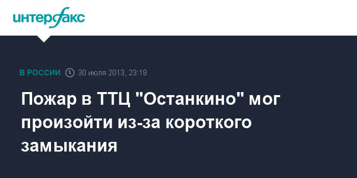 Москва. 30 июля. INTERFAX.RU - Одной из причин пожара в здании телевизионного техцентра "Останкино" могло стать короткое замыкание, сообщил "Интерфаксу" источник в экстренных службах.