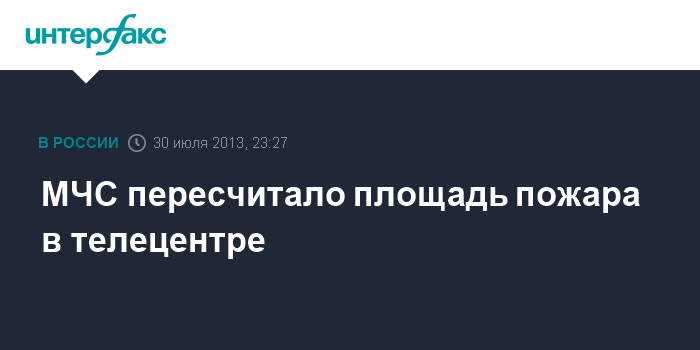 Москва. 30 июля. INTERFAX.RU - Площадь пожара в телевизионном техническом центре "Останкино", по уточненным данным, составила 25 квадратных метров, сообщили "Интерфаксу" в пресс-службе ГУ МЧС России по Москве. "По уточненным данным, площадь возгорания в телецентре составила 25 метров", - сказал сотрудник пресс-службы.
