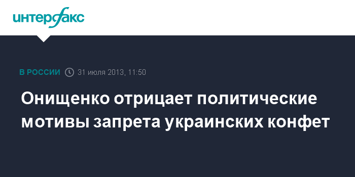 Москва. 31 июля. INTERFAX.RU - Глава Роспотребнадзора главный санитарный врач России Геннадий Онищенко заверяет, что в запрете его ведомством украинских конфет фирмы Roshen нет политической составляющей "Раньше были сыры - болезненная тема была, забылась. Теперь новая тема. Как бы ни кричали, не искали политическую составляющую - не найдут. Речь о качестве, не соответствующем заявленным требованиям", - заявил Онищенко журналистам в среду.