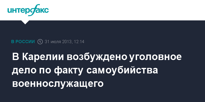 Петрозаводск. 31 июля. INTERFAX.RU - В Карелии возбуждено уголовное дело по факту самоубийства военнослужащего в воинской части в местечке Бесовец под Петрозаводском, сообщил "Интерфаксу" источник в правоохранительных органах республики.