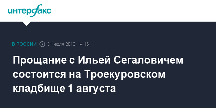 Москва. 31 июля. INTERFAX.RU - Прощание с сооснователем компании "Яндекс" Ильей Сегаловичем, скончавшимся на прошлой неделе в результате раковой опухоли мозга, состоится 1 августа.