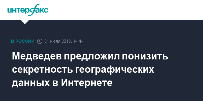 Горки. 31 июля. INTERFAX.RU - Премьер-министр Дмитрий Медведев намерен поручить министерствам и правительству Москвы подготовить документ, снижающий степень секретности географических данных для публикации в интернете цифровых карт.