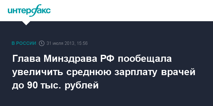 Москва. 31 июля. INTERFAX.RU - Глава Минздрава Вероника Скворцова заявляет, что через пять лет российский врач, в среднем, будет получать 90 тысяч рублей в месяц.