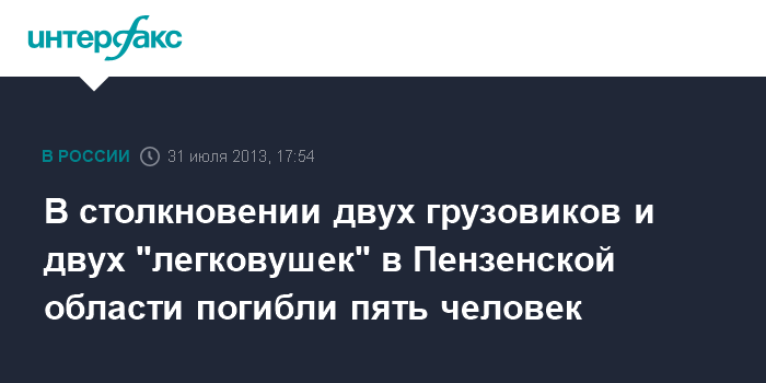 Москва. 31 июля. INTERFAX.RU - Пять человек погибли, еще двое пострадали в ДТП в Пензенской области, сообщи "Интерфаксу" в МЧС России. Авария произошла в 17:16 на 547 километре трассы М-5 в Нижнеломовском районе. По неустановленной причине столкнулись два грузовых и два легковых автомобиля.