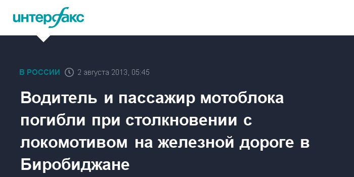 Биробиджан. 2 августа. ИНТЕРФАКС-ДАЛЬНИЙ ВОСТОК - Водитель мотоблока пренебрег запрещающим сигналом светофора и на железнодорожном переезде в Биробиджане столкнулся с локомотивом грузового подвижного состава, два человека погибли.