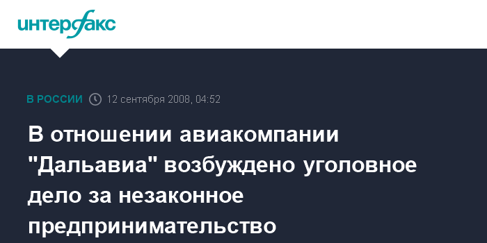 Хабаровск. 12 сентября. ИНТЕРФАКС-ДАЛЬНИЙ ВОСТОК - Следственные органы возбудили уголовное дело в отношении хабаровской авиакомпании "Дальавиа" по статье 171 УК РФ ("незаконное предпринимательство").