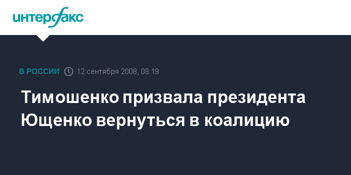 Москва. 12 августа. INTERFAX.RU - Премьер-министр Украины Юлия Тимошенко призывает президента страны Виктор Ющенко отложить эмоции, борьбу за кресло главы государства и вернуться вместе со своей командой в коалицию, говорится в обращении премьера к президенту, переданном агентству "Интерфакс-Украина" в четверг пресс-службой правительства.