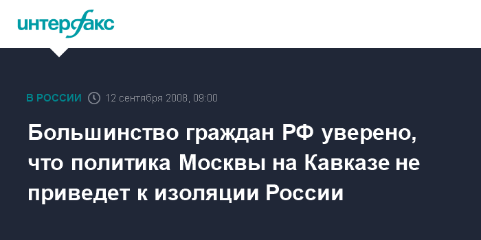 Большинство россиян (59%) уверены, что политика руководства России в связи с ситуацией на Кавказе не приведет к изоляции страны, и напряженность в отношениях Москвы с Западом вскоре спадет.