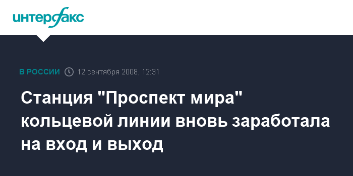 Москва. 12 сентября. INTERFAX.RU - Открылся вестибюль станции метро "Проспект Мира" кольцевой линии, где в сегодня утром произошло обрушение части фасада жилого дома, сообщили "Интерфаксу" в пресс-службе Московского метрополитена.