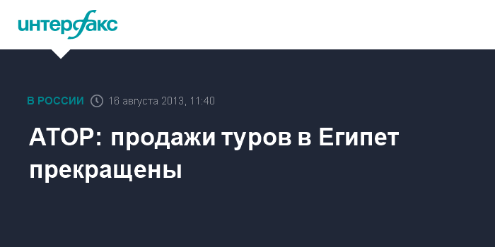 Москва. 16 августа. INTERFAX.RU - Ассоциация туроператоров России (АТОР) объявила о прекращении продажи туров в Египет в связи с соответствующей рекомендацией Ростуризма, вызванной обострением политической ситуации в этой ближневосточной стране.