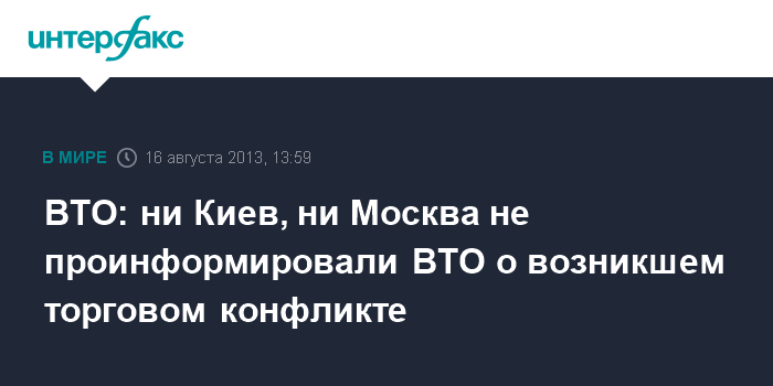 Брюссель. 18 августа. INTERFAX.RU - Всемирной торговой организации (ВТО) неизвестно о торговом споре между Украиной и Россией. Киев не запрашивал о помощи в урегулировании этого конфликта.