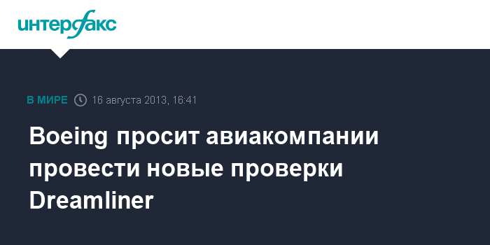 Чикаго. 16 августа. INTERFRAX.RU - Авиастроительный концерн Boeing Co. обратился к авиакомпаниям, эксплуатирующим Boeing-787 Dreamliner, с просьбой проверить правильность конфигурации систем пожарной безопасности двигателей, сообщает агентство Bloomberg.