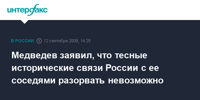 "И эти государства в свою очередь заинтересованы в том, чтобы в России было спокойно. Наши соседи, вне всякого сомнения, близкие государства, которые находятся в сфере традиционных интересов России и, соответственно, Россия находится в сфере интересов наших соседей. Мы настолько близки, что нас невозможно разорвать", - подчеркнул Медведев.