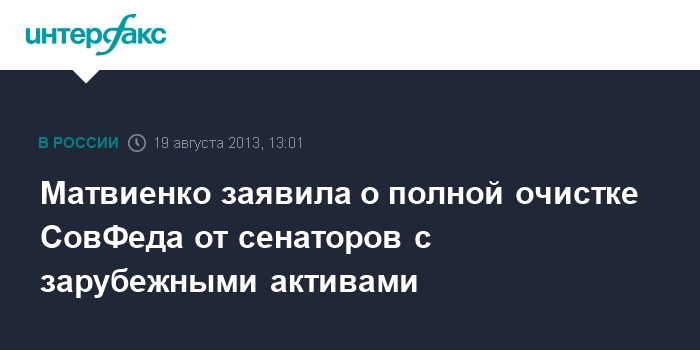 Москва. 19 августа. INTERFAX.RU - Спикер Совета Федерации Валентина Матвиенко заявляет о том, что в верхней палате не осталось обладателей зарубежных счетов и активов.