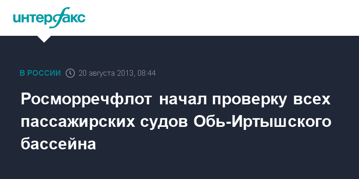 Москва. 20 августа. INTERFAX.RU - ФБУ "Администрация Обь-Иртышского бассейна внутренних водных путей" (подведомственное Росморречфлоту) по обращению Ространснадзора начинает проверку всех пассажирских судов региона, говорится в сообщении, размещенном на сайте министерства транспорта РФ.